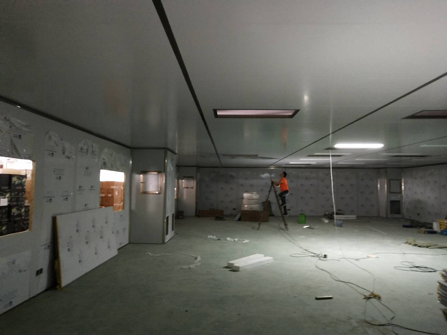 洁净度的实现是通过布置在车间上的FFU高效过滤送风单元过滤,足够的换气次数来实现的,新风采用初效过滤后送入车间。