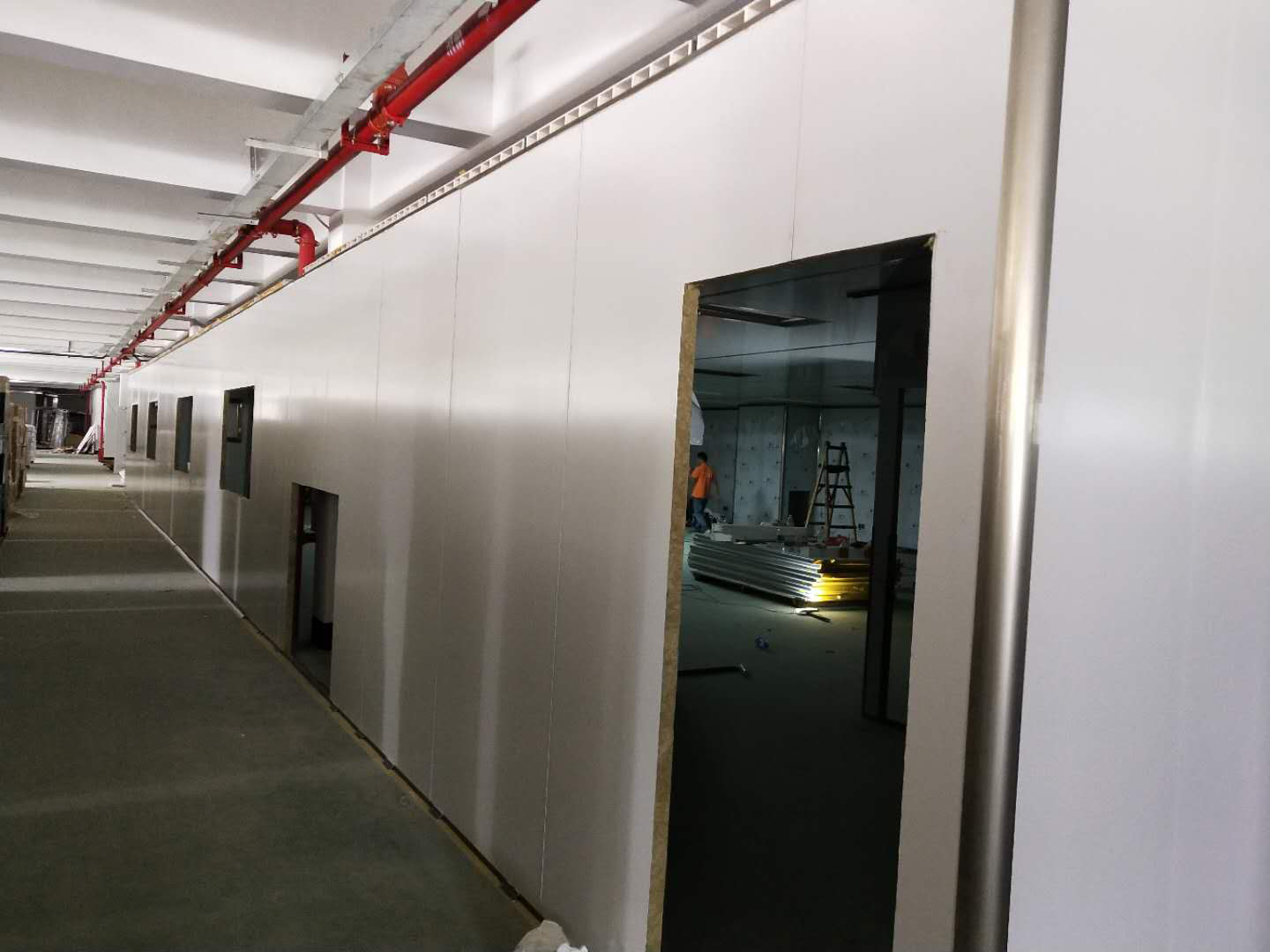 洁净车间的空气循环是通过设置在吊顶内的空调机+末端FFU高效送风单元完成的。其气流组织采用上送下侧回。风系统只设回风管,回风管通过室内回风竖井将室内空气输送至FFU回风口来实现回风。
